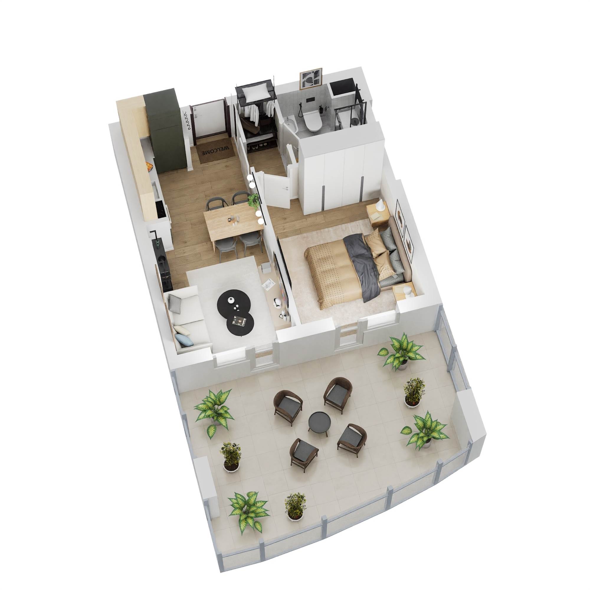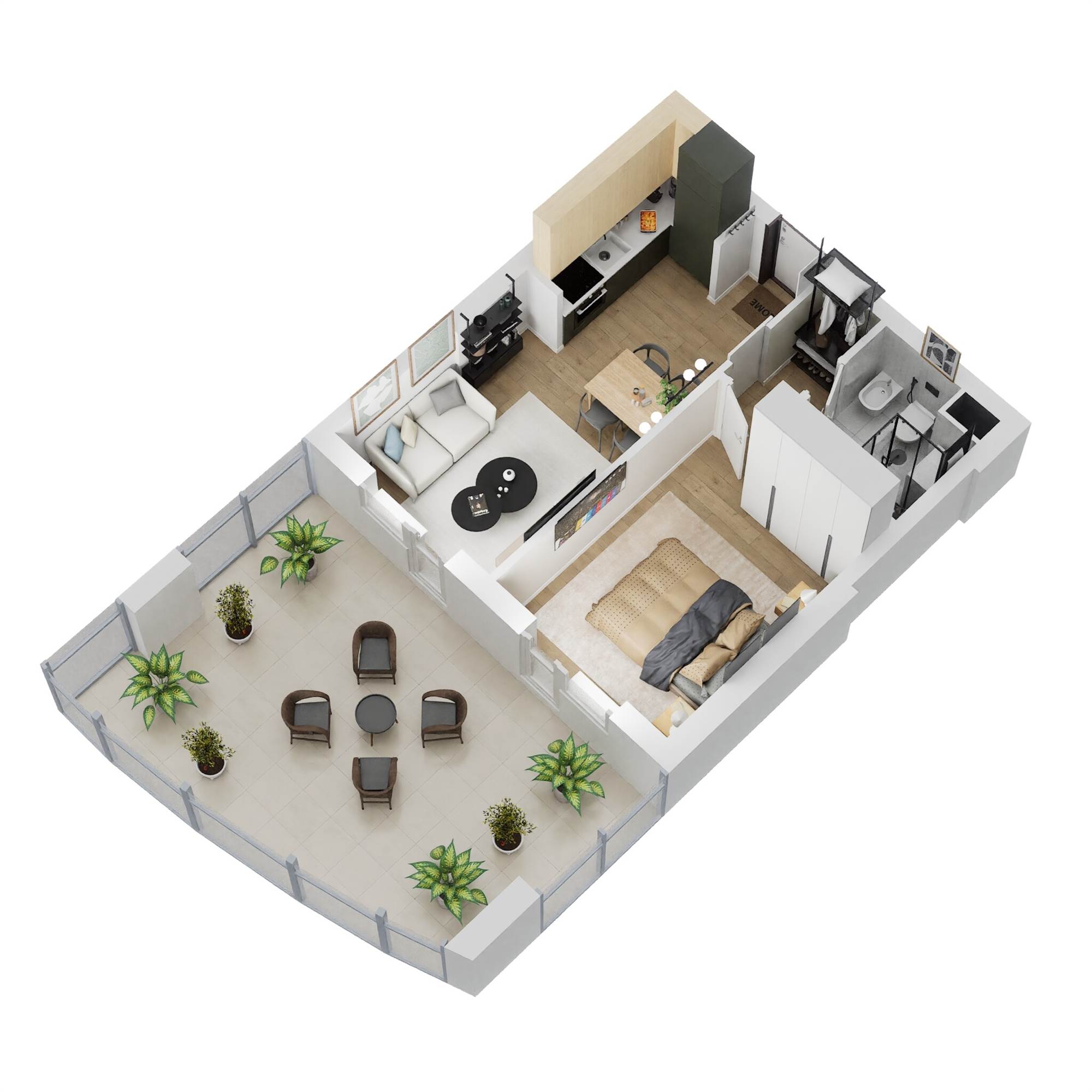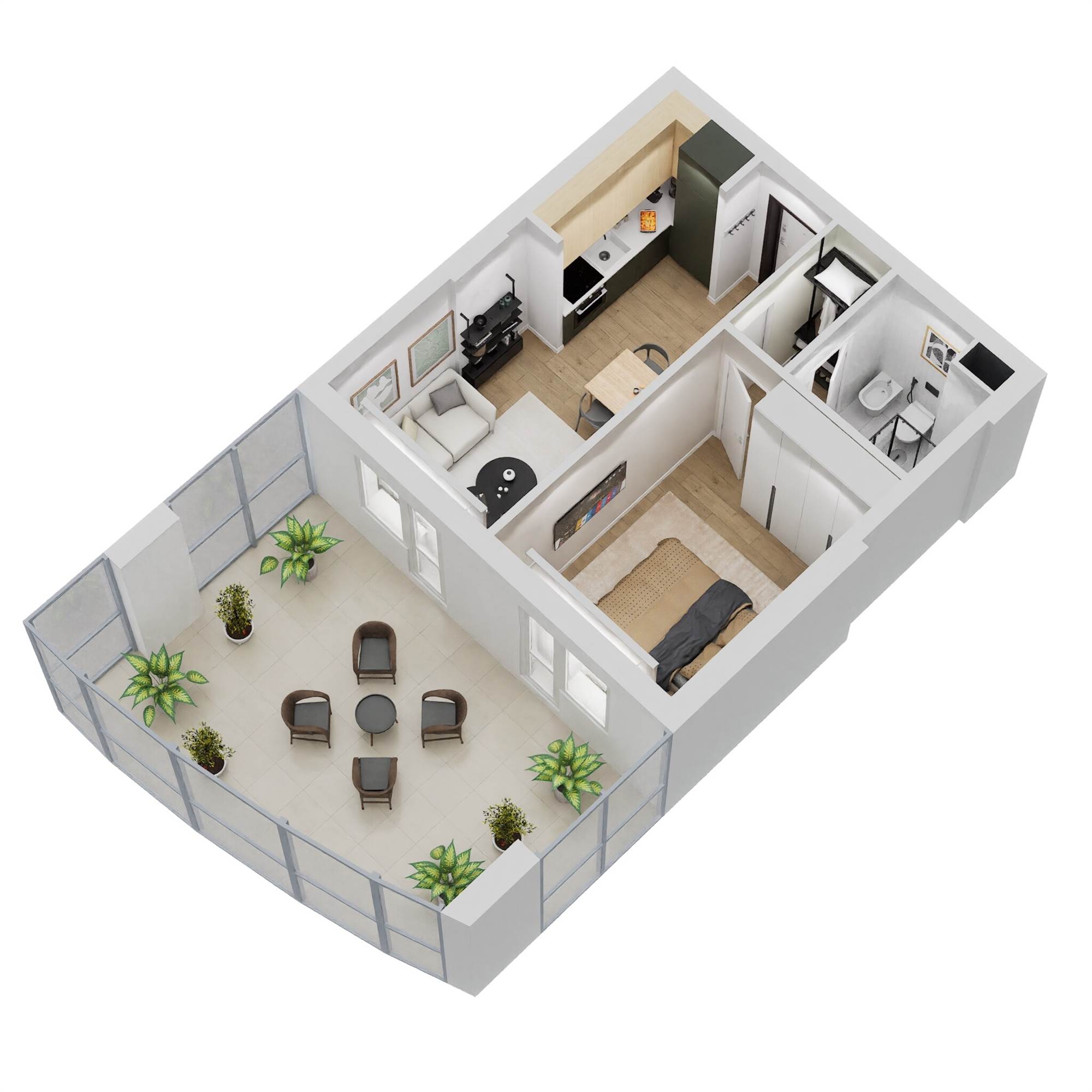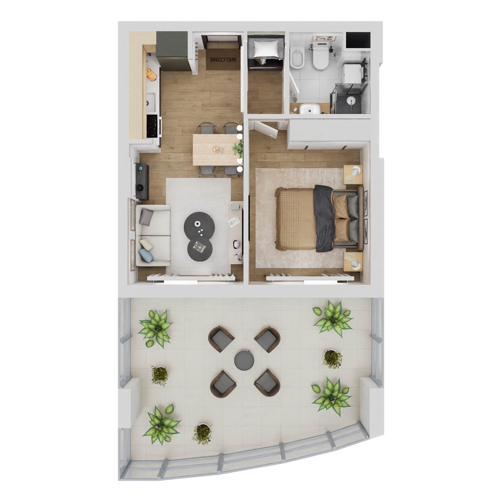 TIPOLOGIA TIPO BILOCALE: Soggiorno con cucina a vista, disimpegno, camera matrimoniale, bagno e balcone vivibile.