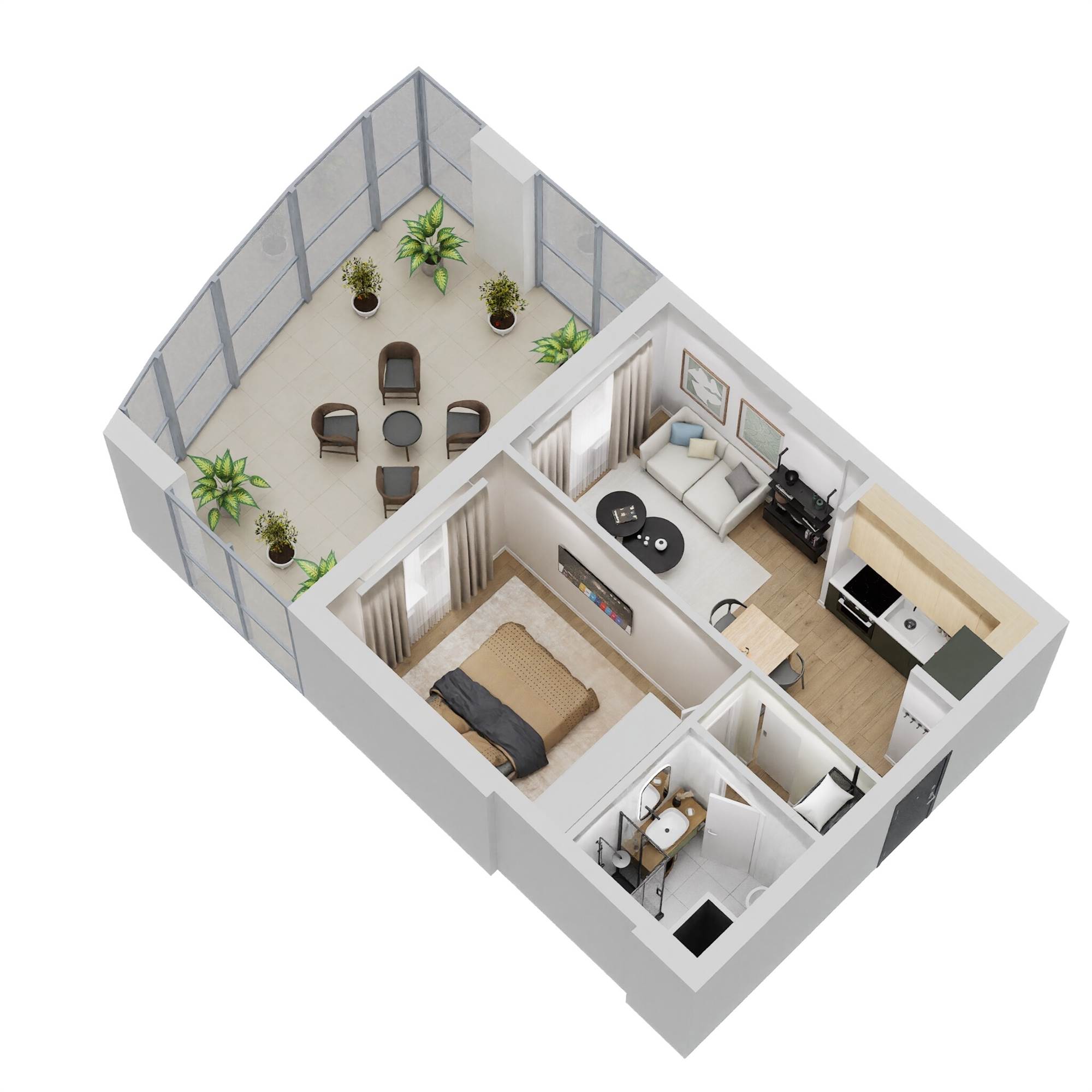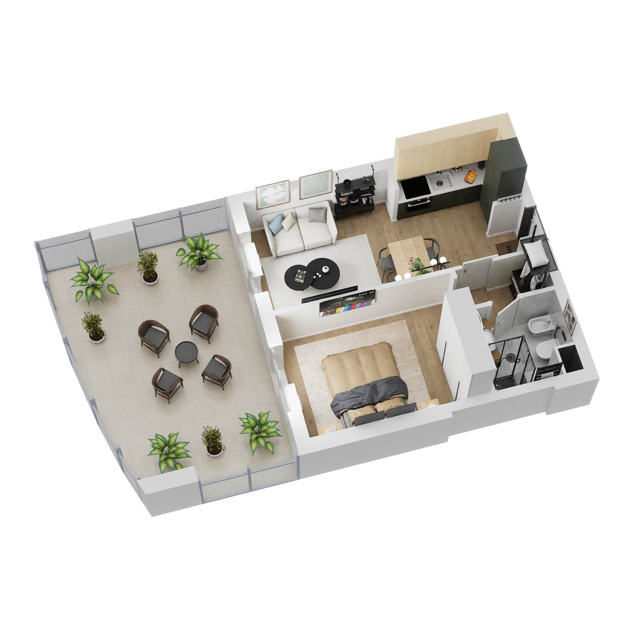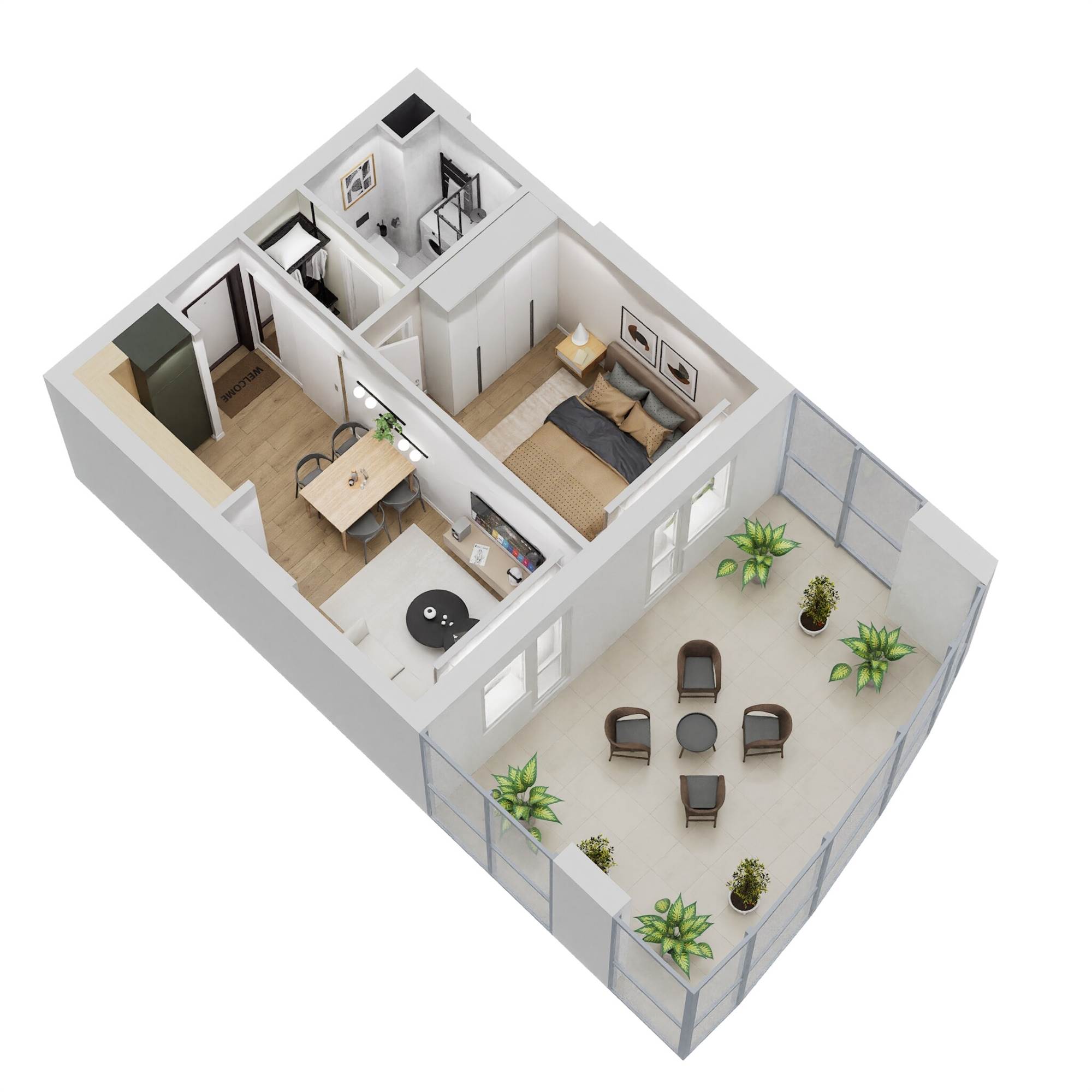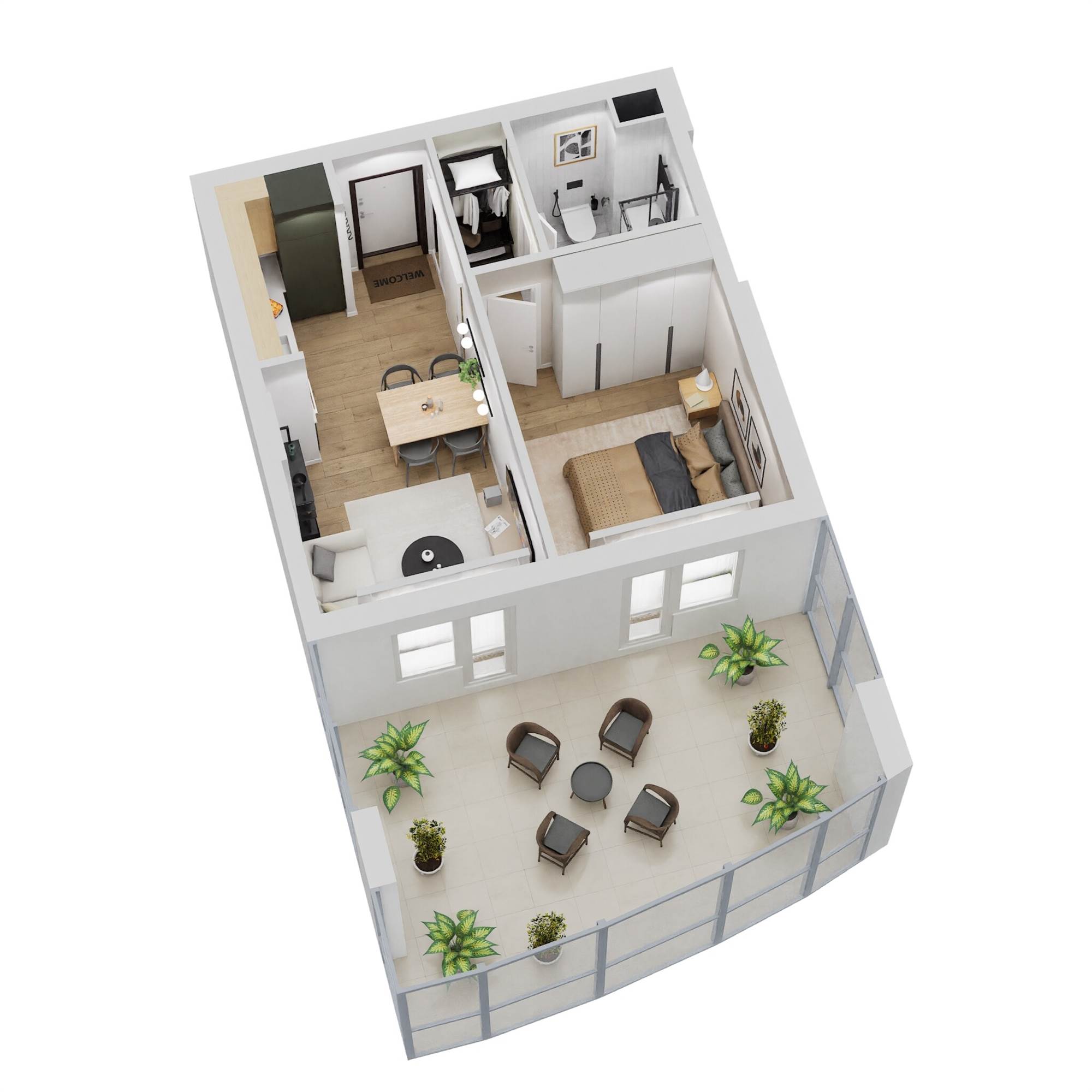 TIPOLOGIA TIPO BILOCALE: Soggiorno con cucina a vista, disimpegno, camera matrimoniale, bagno e balcone vivibile.