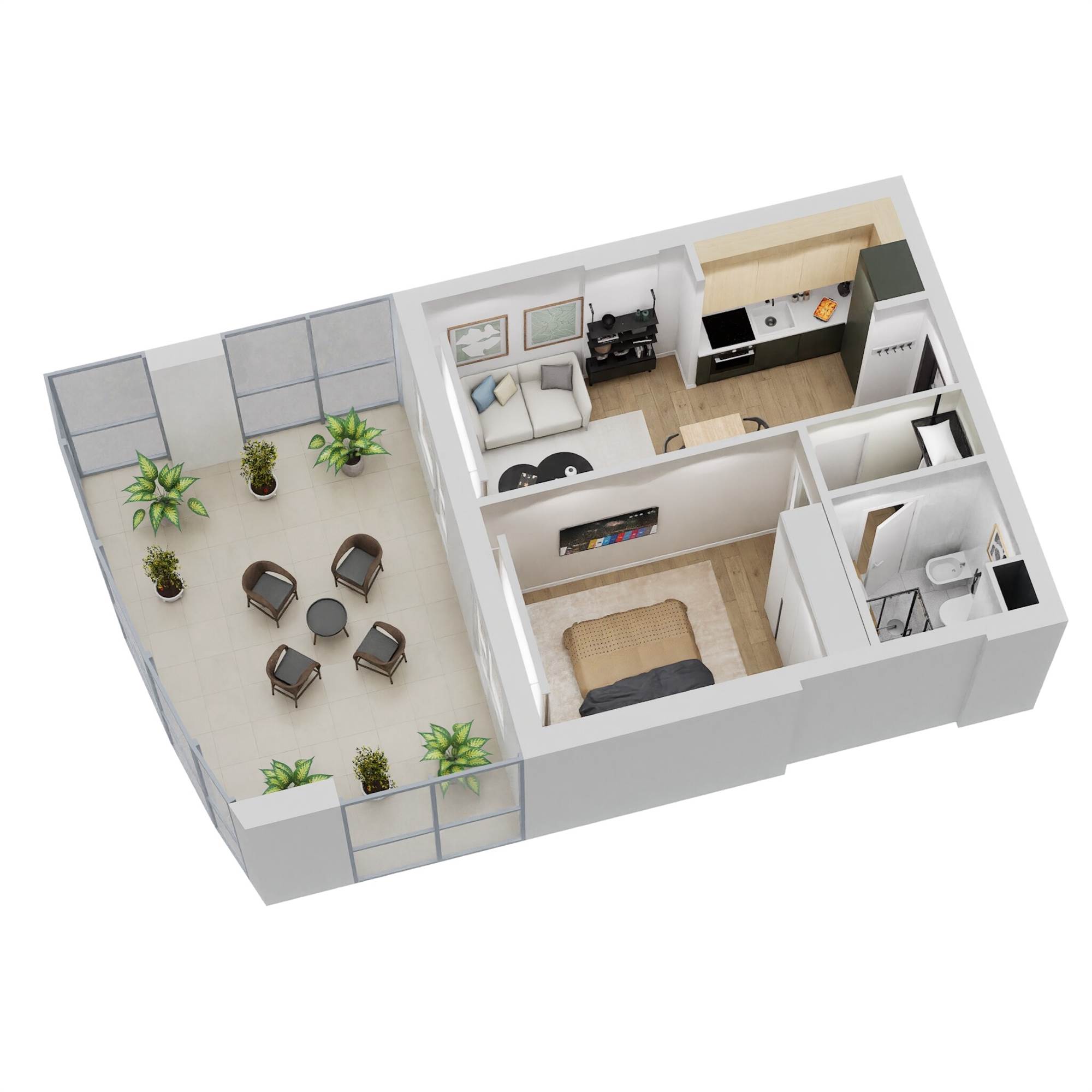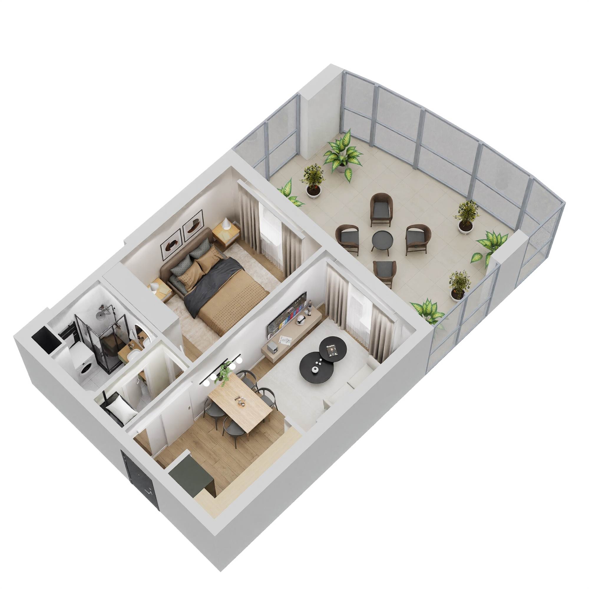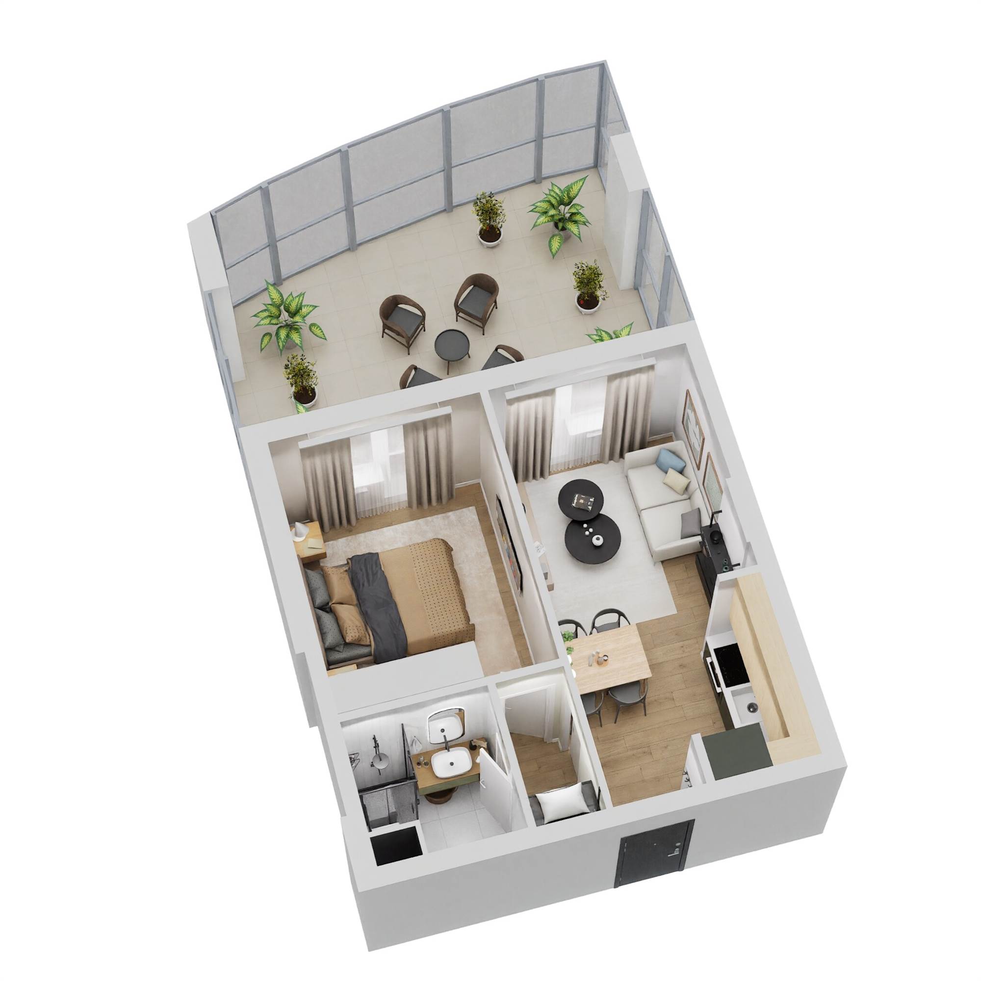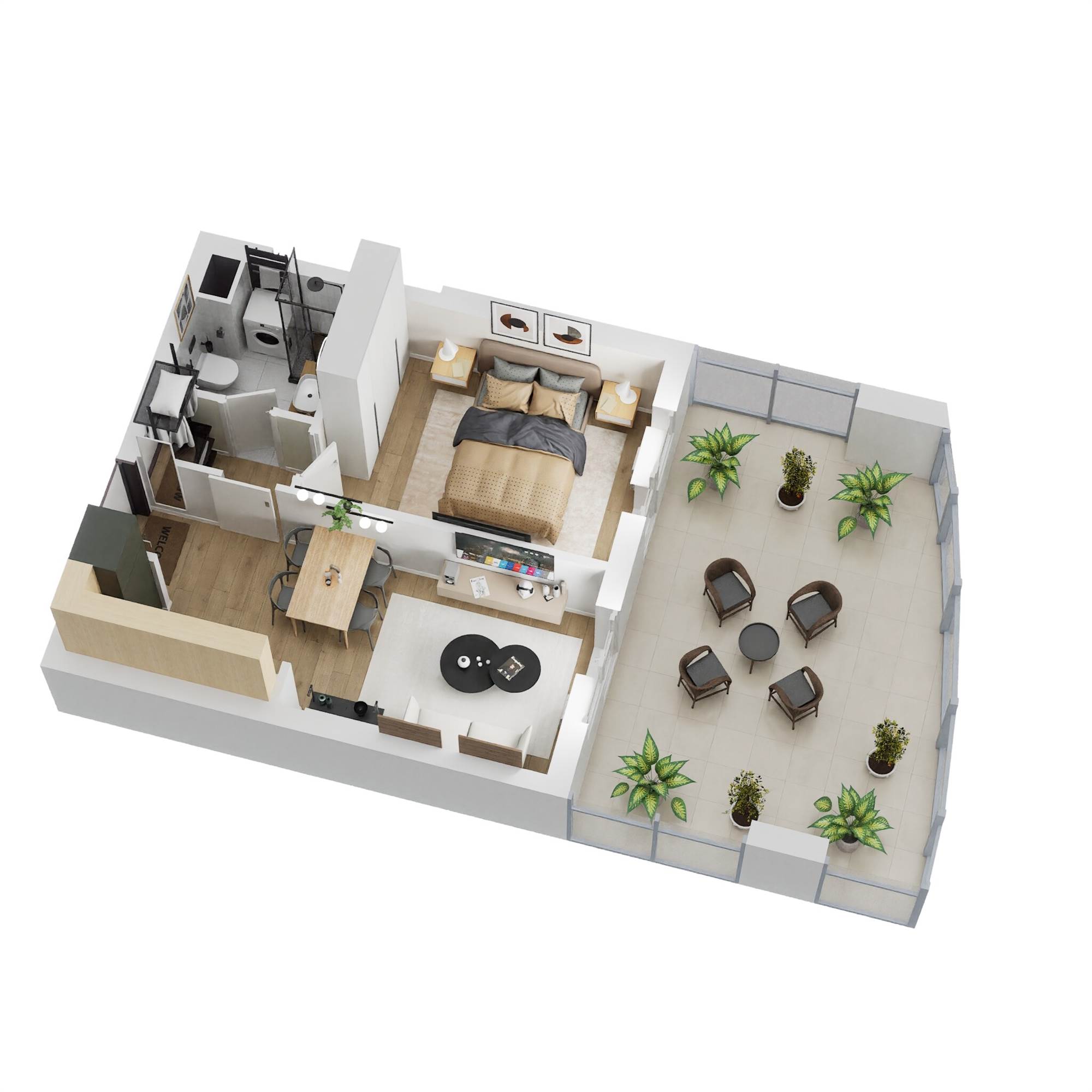 TIPOLOGIA TIPO BILOCALE: Soggiorno con cucina a vista, disimpegno, camera matrimoniale, bagno e balcone vivibile.