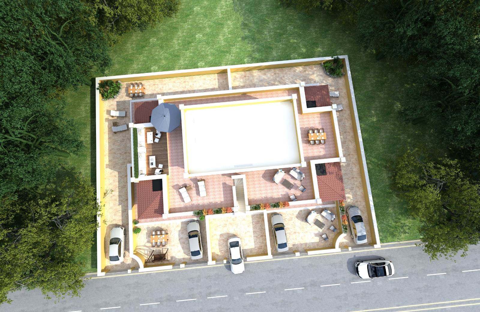 Attualmente sono disponibili: quattro villini al piano terra con ingresso indipendente e giardini angolari privati di circa 100/150, ed un Attico al primo piano con terrazza perimetrale di 200 mq circa distribuito su 4 lati, con giardinetto privato ed entrata indipendente.